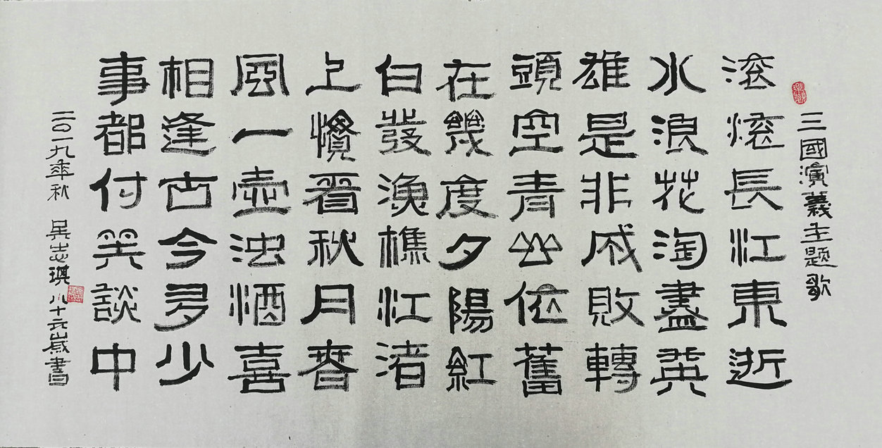 著名書畫收藏鑒賞家、書法理論家楊普義說:吳志琪老師是一位文化藝術的唯美主義者,他恪守“擁書自雄,以墨養心”信念,讀懂了魏晉風骨,又遍覽唐宋以來的前賢墨寶,直追藝術大道;書體出于漢隸,骨氣勁峭,法度謹嚴,于平正中見險絕,于規矩中見飄逸,筆畫穿插,安排妥貼。書法“雄強豪邁、率真俊逸,質樸渾厚、大氣磅礴。”點畫結體有初荷出水之嬌羞,承轉照應有嘉木交柯之蔥茂。其作品“謹嚴勁健,心摹手追,法明理通,很是精絕”。他幾十年如一日孜孜不倦,在書法領域獨領風騷,逐漸形成了自己“結構奇美、筆力勁辣、瀟灑出塵、不落俗套”的藝術風格。