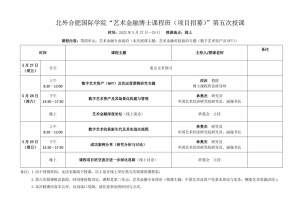 2022年5月27日至29日,北京外國語大學合肥國際學院2022“藝術金融博士課程班(項目招募)”第五次集中授課在騰訊會議線上舉行。課程內容為:藝術金融科技前沿(數字藝術資產與NFT)。