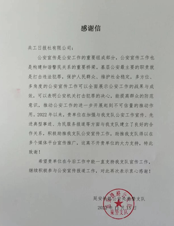 共工日報社財(cái)經(jīng)局11月18日消息(馬立瑜)近日,共工日報社有限公司收到一封來自延安鐵路公安處乘警支隊(duì)的感謝信。信中對共工日報社在2022年以來,共工日報社與延安鐵路公安處乘警支隊(duì)公安工作宣傳,先進(jìn)典型事跡,為民服務(wù)報道等方面所做出的貢獻(xiàn)給予了肯定和感謝。