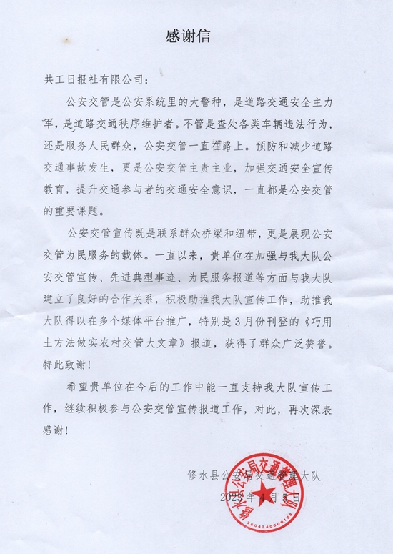 共工日報4月11日電(新法治報記者 廖紅麟)近日,共工日報社有限公司收到了來自江西修水縣公安局交通管理大隊一封熱情洋溢的《感謝信》,感謝共工日報積極助推該大隊宣傳工作。