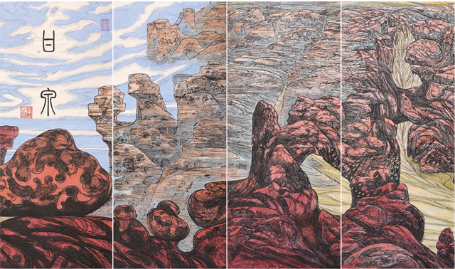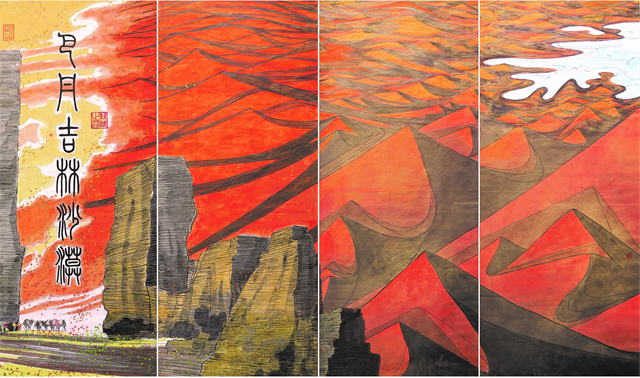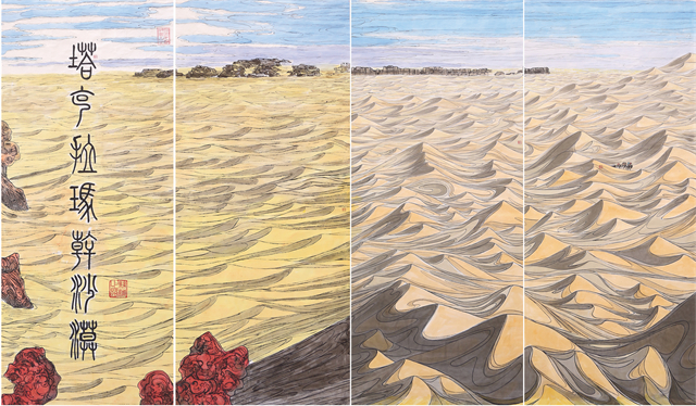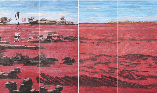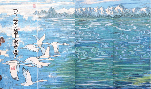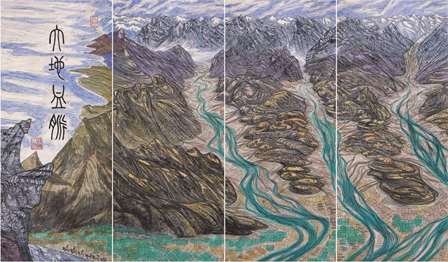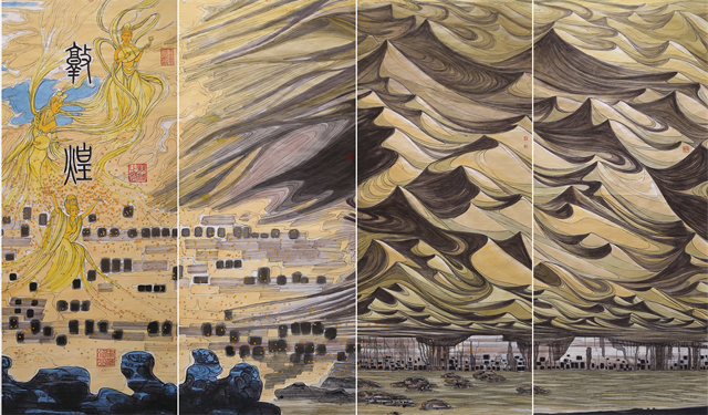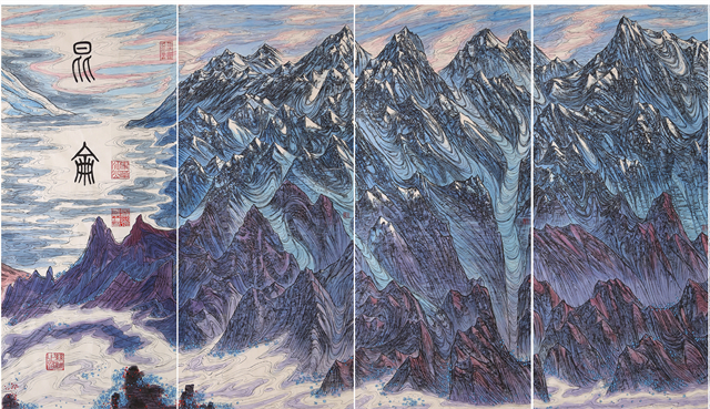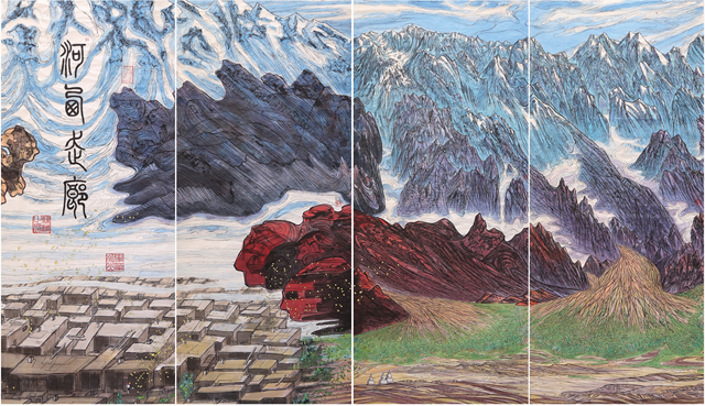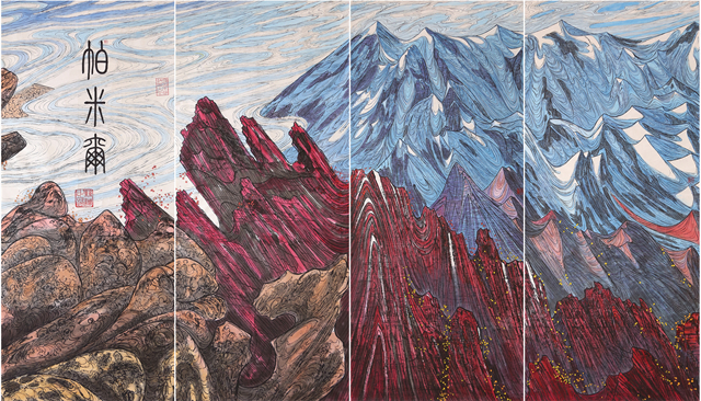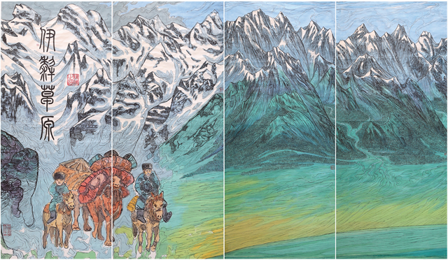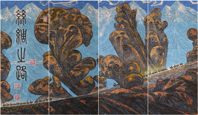 我們的視線越過世界屋脊,看到的是波瀾壯闊、五彩斑斕、氣勢磅礴的絲綢之路那震撼人心的景觀。我們首先看到的是古絲綢之路上最為艱險和神秘的帕米爾高原,接著是最偉大的山脈昆侖山。古往今來的人們稱為“萬山之祖”、“中華龍脈”、“萬神之鄉(xiāng)”的昆侖確實成為“亞洲脊柱”。“赫赫我祖”來自昆侖,中華民族的文化史上昆侖具有顯赫地位,正因如此作者用長達四十多米篇幅創(chuàng)作出地動山搖的昆侖山的氣勢,讓我們無法克制從內(nèi)心發(fā)出驚嘆!敬畏!