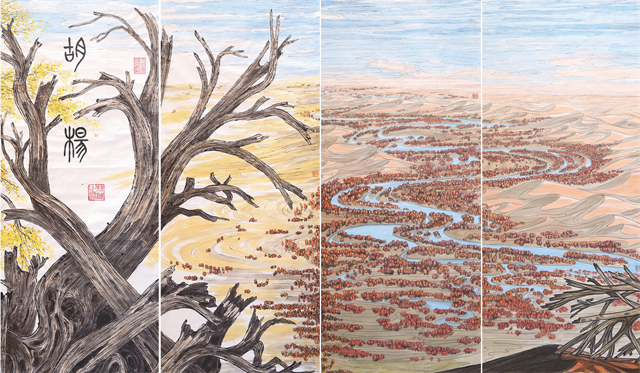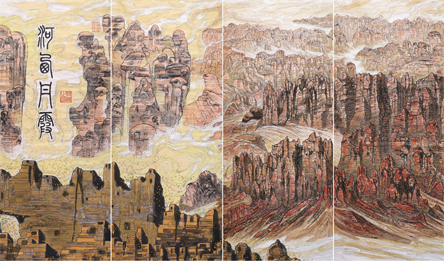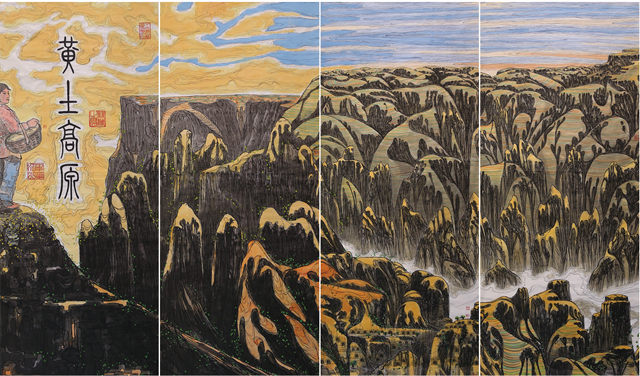 我們順著絲綢之路走到黃土高原面前,我們看到的是世界上最大的黃土塬景觀,塬的四周是神雕鬼塑的溝壑、梁岇和崾峴,巨大的塬猶如起伏的黃河波濤拱托著。數(shù)以千萬計的支溝在頻繁的洪水沖刷下不斷地蠶蝕黃土塬,各溝頭像無數(shù)魔爪伸向黃土塬。黃土塬卻像母親那樣敞開胸懷把自己身上最豐腴的肉一塊一塊地割下來,順著洪水流送到中原大地,輸送進大海,建造起一片又一片孕育中華文化的沃土,自己則留下了溝壑縱橫、千瘡百孔的軀體。我們在畫前深深感悟到,這,就是母親的大地胸懷,是萬古傳唱的中華精神。