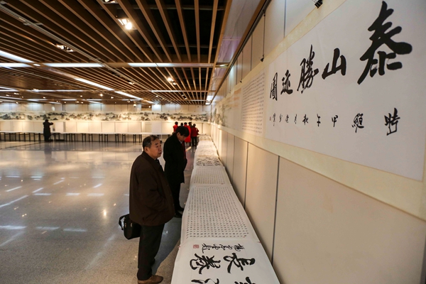 該展第一部分當代著名詩聯書畫家楊憲金、梁京洋、沈懋、呂秀清進行繪寫的中華傳統善、德論著中最具代表性的善德詩聯作品130余幅,以德為統領,該作品以善為主題,將歷代名家關于善、德的詩聯和書畫藝術創作有機整合一體,既體現以善、德為核心的中華傳統文化精髓,理清善、德的應用與發展,又適應時代文化發展和精神審美的需要。第二部分為楊憲金組織當代書畫藝術家歷時四年創作的長120米高0.68米的鴻篇巨制——泰山勝跡圖暨泰山勝跡詩聯書法長卷,泰山勝跡圖(工筆、寫意兩卷)系統描繪泰山人文景觀的發展軌跡,整體畫面從創意到謀篇,從構圖到筆墨技法,從款識用印到材質、裝裱始終貫穿泰山人文景物之氣象,體現出華夏之魂、昂揚向上的時代精神,展現出五岳獨尊、雄偉壯麗的氣勢,創造了泰山繪畫史上的唯一一幅具有強烈時代特征的精品力作,其氣勢恢宏,波瀾壯闊,雄渾雅秀,造化天成,今人嘆為觀止。