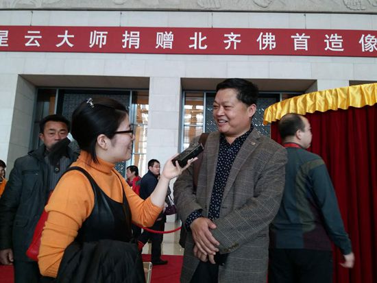 中國佛學書畫院秘書長黃福軍在佛像捐贈儀式上接受媒體采訪