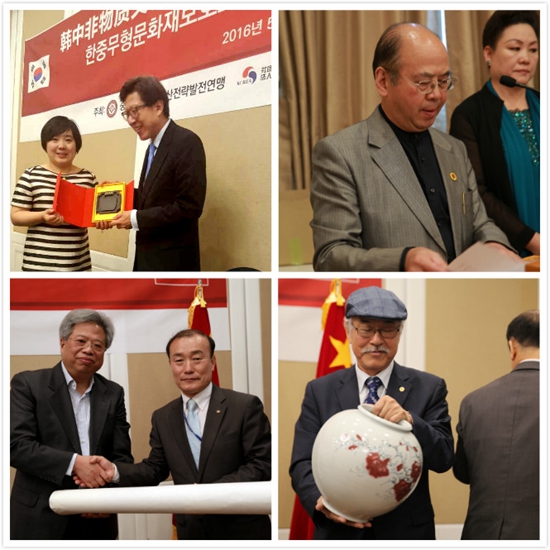 左上/論壇組委會秘書長黃中向樸亨峻秘書長介紹中方非遺傳承人作品