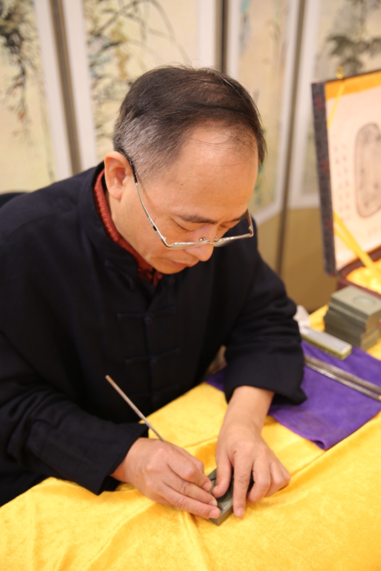 制硯大師王安平代表中國非遺傳承人在韓國國會現場展示端硯制作技藝