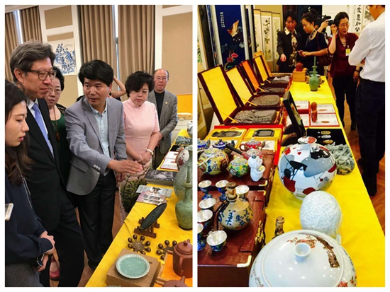 中華炎黃文化研究會硯文化聯合會宣傳部長黃中向樸亨峻秘書長介紹中方非遺傳承人作品飛天硯和蛟龍硯
