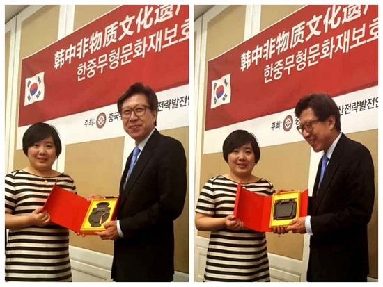 組委會會常務副秘書長趙蘋代表中華炎黃文化研究會硯文化聯合會向韓國國會捐贈飛天硯和蛟龍硯