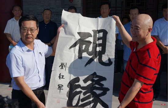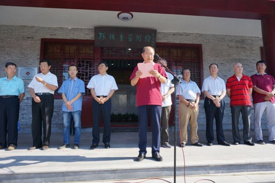 9月8日上午,由中華炎黃文化研究會硯文化聯(lián)合會、山東省樂陵市委、市政府共同舉辦的2016樂陵市中華硯文化展覽,在樂陵市孫軼青藝術(shù)館隆重開幕。中華炎黃文化研究會硯文化聯(lián)合會常務(wù)副會長張國興、劉克唐、金彤、蘇文源,副會長火來勝、傅聿勝、馮明躍,以及專委會專家陳國源,常務(wù)副秘書長于忠文、李杰、陰巍等20余人組成代表團(tuán)出席開幕式。參加開幕式的還有,解放軍報(bào)社原社長、孫軼青先生之子孫曉青將軍,樂陵市委書記曲峰和市人大、市政府、市政協(xié),市直機(jī)關(guān)、各鄉(xiāng)鎮(zhèn)領(lǐng)導(dǎo),參加明代書法家邢侗書法臨帖展的書畫家,以及社會各界群眾共200余人。張國興副會長代表聯(lián)合會和劉紅軍會長致開幕詞,蘇文源副會長代表聯(lián)合會向樂陵市中小學(xué)校捐贈300套學(xué)生硯,金彤副會長向樂陵市孫軼青藝術(shù)館贈送劉紅軍會長題字“硯緣”。