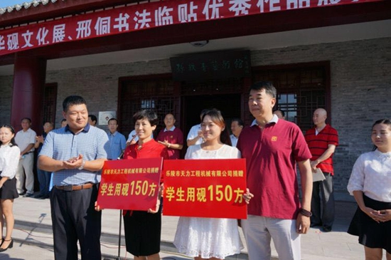 蘇文源副會長與樂陵市企業(yè)家桑振江向?qū)W校及學(xué)生代表捐贈學(xué)生硯