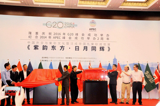2016年9月20日,由中國前外交官聯(lián)誼會(huì)主辦的《紫韻東方·日月同輝》中國外交與紫砂文化暨汪成瓊國禮紫砂成就展,在北京懷柔雁棲湖APEC會(huì)議中心隆重舉行。據(jù)悉,主辦方邀請(qǐng)了杭州G20峰會(huì)與會(huì)國二十國駐華使節(jié)和聯(lián)合國代表,出席本次活動(dòng)的有外交界、中國工藝美術(shù)界、宜興市等社會(huì)各界領(lǐng)導(dǎo)及國禮紫砂大師汪成瓊出席了本次活動(dòng)。