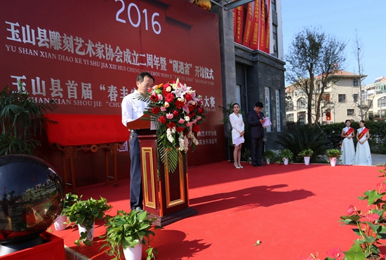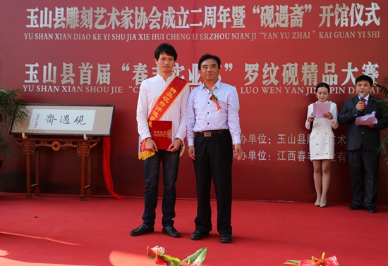 玉山縣人民政府副縣長俞銀水、玉山縣雕刻家協會會長廖芝軍先后代表玉山縣政府與縣雕刻家協會致辭。中華炎黃文化研究會常務副會長,中華炎黃文化研究會硯文化聯合會名譽會長劉紅軍先生,中共玉山縣委副書記、縣長徐樹斌先生為玉山縣羅紋硯主題館“硯遇齋開館揭牌”。中華炎黃文化研究會副會長,中華炎黃文化研究會硯文化聯合會執行會長兼秘書長唐本高向玉山縣雕刻家協會贈送中華炎黃文化研究會硯文化聯合會副會長吳笠谷創作雕制的珍藏版《飛天硯》。隨后玉山縣首屆“春豐實業杯”羅紋硯精品大賽在春豐實業大廈揭曉,由中華炎黃文化研究會硯文化聯合會常務副秘書長兼外聯部部長陰巍,中華炎黃文化研究會硯文化聯合會宣傳部長黃中,中華炎黃文化研究會硯文化聯合會劉紅軍會長秘書張漢榮、玉山縣委常委、宣傳部長胡琳宇,玉山縣人民政府副縣長俞銀水、玉山縣人民政府副縣長、公安局局長雷波,玉山縣人民政府揚宏才,縣政協副主席楊軍為玉山首屆“春豐實業杯”羅紋硯精品大賽優秀獎獲得者余林富、吳俊岳、何文輝、李家源、劉江、俞志強、王禮敏、葉金榮、姜慶壽、汪慈銀、童金華、葉俊、葉哲旺、俞令芳、章伙軍、張磊頒獎;中華炎黃文化研究會硯文化聯合會副會長陳慶強,玉山縣人大主任張常清、玉山縣政協主席朱明善為三等獎獲得者王世軍、葉俊岳、孫文康頒獎;中國工藝美術大師王祖偉、中華硯文化聯合會副會長、吳笠谷為二等獎獲得者章其琳、程濤頒獎;上饒市文聯主席張天霞為一等獎獲得者張超頒獎。頒獎活動結束后,在玉山縣雕刻家協會廖芝軍會長等陪同下,與會領導嘉賓參觀了玉山縣羅紋硯主題館“春豐實業杯”羅紋硯精品獲獎作品展并考察了玉山縣七里街雕刻一條街。