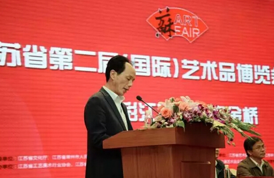 常州市文化廣電新聞出版局局長陳建共在閉幕式中指出此次在常州舉辦的江蘇省第二屆(國際)藝術品博覽會,以“精彩江蘇·藝海金橋”為主題,集展覽展示、主題活動、高端對話、交易拍賣、鑒定評估、評優頒獎等為一體,運用科技與金融“雙輪驅動”,取得了良好的社會效益和經濟效益,呈現出三個方面的特色亮點:一是規模空前,成果豐碩。本屆藝博會共吸引400家國內外藝術畫廊、藝術家、藝術品金融代表企業等機構參展,參觀總人數超6萬人次,現場成交2.5億元,意向合同金額近12億元,既是一場萬眾矚目的“藝術盛宴”,同時更是一場盛況空前的“新經濟盛宴”。二是底蘊深厚,精品云集。本屆藝博會不僅展現了江蘇乃至全國藝術品市場發展的最新成果,更著力吸引了一大批代表國內外頂尖水平的藝術精品、藝術巨匠,呈現出開放、包容的藝術品產業發展全新格局。三是創新融合,引領方向。本屆藝博會首次舉辦了“中國藝術品財富管理環太湖論壇”,首次專門開辟了青年藝術展區,首次推出了市民公益鑒定活動,充分彰顯了藝術與金融、藝術與科技、藝術與互聯網融合發展的趨勢。此外,我們將以本屆藝博會的成功舉辦為新的起點,進一步創新常州藝術品市場發展的理念,進一步加快文化創意產業發展步伐,進一步提升藝術服務市民百姓的能力,為開創江蘇藝術品行業發展新局面做好示范、當好表率。