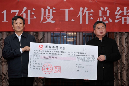 中華炎黃文化研究會副會長、硯文化聯合會秘書長唐本高代表聯合會接受企業家邵利民捐款
