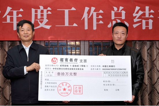 中華炎黃文化研究會副會長、硯文化聯合會秘書長唐本高代表聯合會接受山東群發集團董事長徐軍捐款