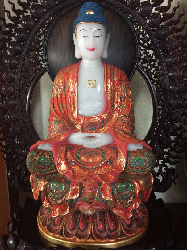 中國(guó)玉石雕刻大師劉昱廷 緬甸白玉極彩釋迦牟尼佛