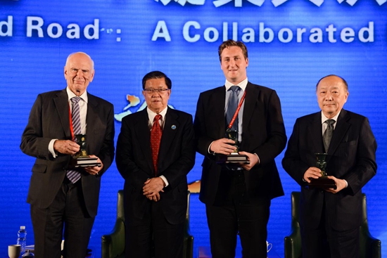 博鰲亞洲論壇前秘書長龍永圖(左二),將中國尊贈與澳大利亞執政黨主席理查德(左一)、達沃斯澳洲主席Stephen(右二)、中國海外協會會長胡衛平(右一)