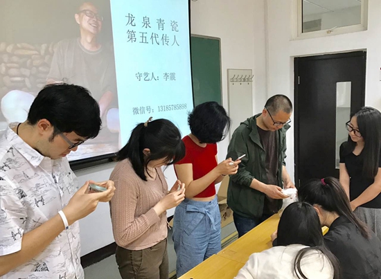 李震教授結合自己多年來的學習與實踐,把自己收藏的精品青瓷標本帶到教室里給研究生們上手進行比對分析,讓研究生們感受800年前的宋瓷與今天瓷器的異同,他從青瓷的釉水、胎質以及整體器形和殘片的手感、光澤等各種元素進行比對分析與講解,讓研究生們在課堂上就能全方位感悟到青瓷之美的魅力,這種實物教學模式即新穎又有實效,深深吸引了每一位研究生,讓他們對青瓷的興趣倍增,對學生的興趣培養就教學而言有著重要意義。