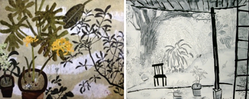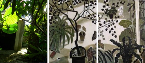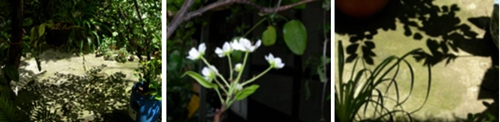 「我的院子是個小雜院,它的形成似乎毫無規劃,一切聽天由命。東、西北角上各有一棵大榕樹,因為樹圍夠粗年事亦高,已被文化局列管保護,另有老槴子花,七里香和杜鵑,都是日據時代留下來的,參差樹蔭間的姑婆芋和蕨草、藤蔓,是自己飄來生長的,而其它大大小小各種盆栽則來自各方的收留,經年累月之間,它們已找到自己的生長姿態,疏疏落落,相掩相映,隨晨昏光線轉移各有意趣,而鳥兒與斑鳩,早晚都來這兒逗留。我喜歡這自然般的感覺,有一些野趣,又帶著點斯文,非常樸拙,更有一番神韻。十多年來,與一個院子朝夕相處,我慢慢學習尊重,并時時得著喜悅。」