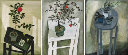 ■ 「靜物系列」出于畫家對舊木桌沉靜樸實的質感情有獨鍾,是對寧靜家居的一種喜悅,也是老院子生活的情感延伸。畫面藉著簡單物象的詮釋與描繪,表現出東方哲思對于物我靜觀的當下感悟,作品風格呈現一種悠然自在的生活情致,是中國文化所特有的內涵意境;具有女性抒情意象的細致典雅,卻也有著頗見強度的造型張力,是女性畫家少見的表現。