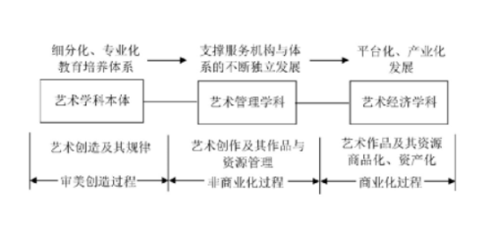 如圖2所示,傳統的藝術學科本體是細分化、專業化的教育培養體系,其主要研究藝術創造及其規律,即審美創造的過程;而藝術管理學科是對學科本體起支撐服務作用的一些機構與體系不斷獨立發展的結果,其主要研究藝術創作及其作品與資源如何進行有效的管理,即藝術非商業化的過程;而藝術經濟學科是在藝術市場逐漸走向平臺化、產業化發展背景下所誕生的新學科,其主要研究藝術作品及其資源商品化、資產化的模式方法,即藝術商業化的過程。