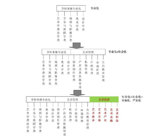 藝術學原來是文學這一學科門類下的一個一級學科,2011年國務院學位委員會、教育部頒布了新的《學位授予和人才培養學科目錄》,藝術學首次從文學門類中獨立出來,成為新的第13個學科門類。藝術學門類下設一級學科5個,30多種專業。5個一級學科分別為:藝術學理論、音樂與舞蹈學、戲劇與影視學、美術學和設計學。事實上,在現實需求與學科張力的互動中,這種分類的不足與缺陷越來越明顯,特別是在藝術市場、藝術產業與新科技融合快速發展的面前,我們很難僅僅在藝術學理論項下進行修修補補,雖然這種修補在當下還很重要,事實上,藝術學理論這個“筐”很難裝下迅速發展的現實需要。