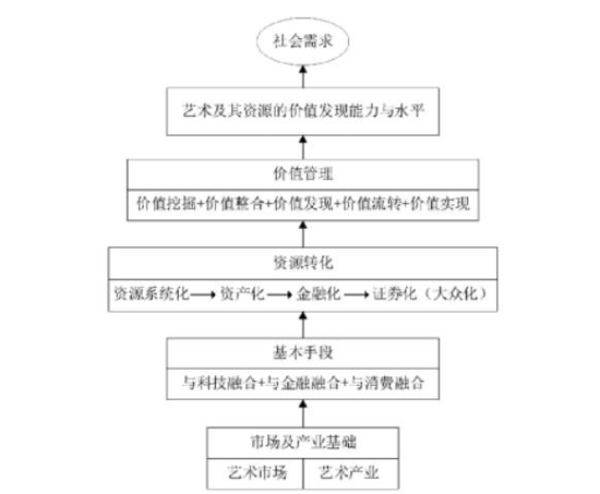 藝術經濟的發展有其特有的基本發展邏輯與路徑。如圖1所示,從藝術經濟發展的基本邏輯來看,首先是市場及產業基礎部分,即藝術市場、藝術產業的建立是其市場基礎與產業發展的基礎,此后基于對市場及產業發展的創新手段的探索,在需求拉動下,又出現了藝術市場及產業與科技融合、與金融融合、與消費融合這些創新手段。在藝術市場及產業與上述業態融合的過程中,一條藝術資源轉化的主線也逐漸清晰,概括來說就是藝術及其資源的系統化、資產化、金融化、證券化(大眾化)的路徑逐漸確立。這條資源轉化的路徑發展的背后,所依托的是藝術價值的綜合管理體系的完善,即藝術價值的挖掘、整合、再發現、流轉和價值的最終實現幾個環節逐漸成為藝術市場及其產業逐漸完善,藝術經濟這一產業形態逐漸形成的基礎,而藝術及其資源的價值發現能力與水平的提升,也成為藝術經濟能否健康發展的重中之重,這其中,堅持圍繞不斷發展變化的社會需求導向,也是當下及未來藝術市場、藝術產業與藝術經濟發展的重要驅動。