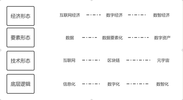 1、經濟形態層面。它包括三個新經濟形態的遞進: 互聯網經濟形態、數字經濟形態與數智經濟形態。