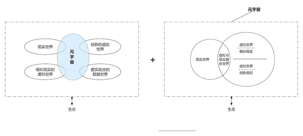圖中我們可以清晰的看出元宇宙的生態組成和其內部的關系。首先是現實世界、創新的虛擬世界、模擬現實的虛擬世界和虛實結合的超越世界,這四個部分的融合地帶就是我們所說的元宇宙。這是基于元宇宙虛實相生、虛實結合的基座而言,也是整個生態的組成部分之一。而在右邊的生態之中,虛擬世界被分成了模擬現實的虛擬世界和創新虛擬世界,以及與現實世界交錯的虛擬與現實融合世界,這一整個生態形成了元宇宙系統。雖然是同樣的四大板塊,但是其不同的交錯和融合方式背后則是數智化過程中元宇宙系統的發展和變化。