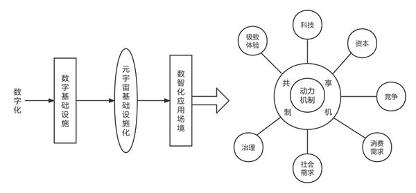 數智化的進程之中,最為重要的就是從元宇宙基礎設施化落地到數智化應用場境這一部分。從最基礎的數字化開始,到數字基礎設施的完善,這是整個動力機制中最為基礎的部分,沒有這一步的轉化,元宇宙的基座很難形成,也不會有元宇宙基礎設施化。而場境所代表的就是元宇宙場域中的在境,從數字化到數智化的底層邏輯改變離不開基礎設施不斷升級的推動。而在數智化應用場境之下,以動力機制為中心,共享機制為外軸,延伸出科技、資本、競爭、治理、極致體驗、消費需求和社會需求七個方面。從這七個角度,可以覆蓋到各行各業到未來數智化發展,這也是整個動力機制的一大構成,即從多個層面來共同推動數智化進程。