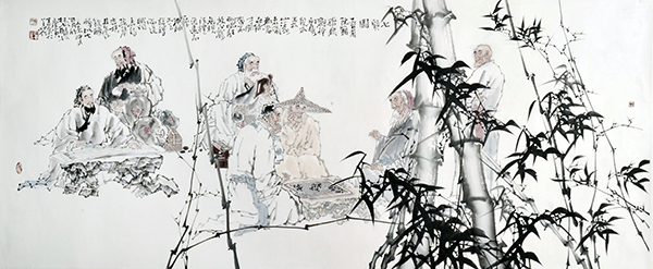品讀他的寫意人物畫,我們能夠感受到一種古色古香的意韻表達,人物形象刻畫經典,形神兼備。題款中的古詩與畫面的內容相輔相成,很好地起到了深化主題、畫龍點睛的作用,顯示了畫家較高的文學修養。如《飲中八仙圖》畫面幽深雅致,構圖嚴謹,人物彼此呼應,體現了畫面的故事情節;遠處的山石、近處的青藤襯托了整個氛圍,使畫面充滿了古韻氣息。《七賢圖》描繪了文人雅集的場景,構圖疏密得當,設色淡雅,筆法細勁流利,人物刻畫細致入微,動態各異!端上缕奋酚镁流暢迂回,勾斫頓挫,形態與身姿形象地刻畫出人物性格及內心世界,有“古法淵雅,靜穆渾然”的格調,且構圖繁簡相宜,景致與人物渾然一體,達到天人合一的藝術境界。