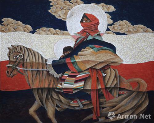 計美赤列:這件作品的創(chuàng)作其實有一段故事,關(guān)于我一個朋友的故事,他是法國來的藏學家尼古拉,是西藏大學的老師,西藏大學講課的時候他與一個純牧民說藏語的藏族學生戀愛了,后來這個藏族女孩就嫁到了法國。后來當他們有了孩子第一次回家鄉(xiāng)的時候,我碰到他們,小孩兒特別可愛,當時下著大雪,他在母親的懷抱里,露出一點點頭,大家知道藏族衣服很寬大,既可以當包也可以裝小孩兒,當時我就突然感悟到那個畫面就跟我追求的東西有關(guān),所以就有意識的畫了這張畫。