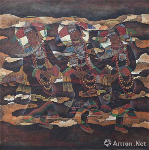 我的作品《古海無云》中三個女孩跳舞的舞姿就是阿里地區(qū)古蘭縣的舞蹈,他們每年過節(jié)的時候才跳這個舞,過節(jié)的時候會有一些特殊的儀式,我把這些內(nèi)容都有意識的銘記在我的心里,就創(chuàng)作了這幅畫。這幅畫我用的是綜合材料,有油畫、丙烯、國畫,還有礦物顏色,是實驗性的創(chuàng)作,其實最初畫的時候是我心里理想的顏色,后來由于材料的混合也出現(xiàn)了一些化學反應(yīng),畫面中也出現(xiàn)了意想不到的效果,這件作品后來參加了第三屆中國油畫展,獲得優(yōu)秀獎。所以我就起了《古海無云》。