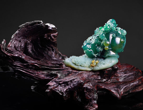 《吐納春秋》: 作品用春帶彩翡翠為原材料,質(zhì)地細(xì)膩,造型生動(dòng),難能可貴的是作者把天然紅中帶黑的顏色巧妙地雕刻為十六只玉兔的眼睛,猶如畫龍點(diǎn)睛般生華。每只兔子都動(dòng)態(tài)各異,活潑可愛,身手敏捷,寓意老少身體健康。所獲獎(jiǎng)項(xiàng):2012年中國(guó)玉(石)器百花獎(jiǎng)金獎(jiǎng); 2012-2013年度肇慶市工藝美術(shù)精品展獲“工藝美術(shù)精品獎(jiǎng)”; 2012年中華玉雕“華表獎(jiǎng)”銀獎(jiǎng)。