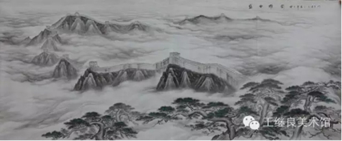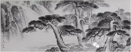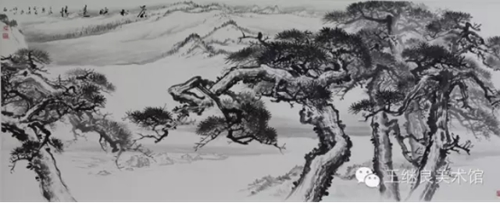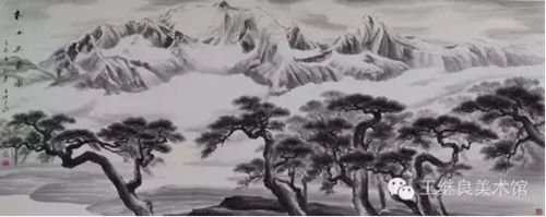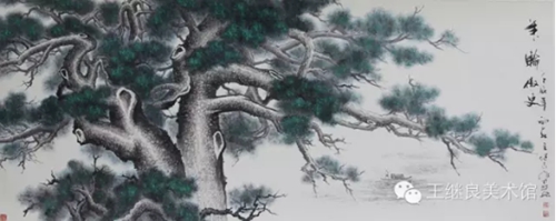 王繼良老師是以做學問的心態(tài)來把握古人的筆法、墨法、章法,是以意思上、氣韻上來作畫。世人畫松多以山水襯托松樹;而王繼良老師順應天然情理,以松樹烘托山水,山為母,松為子;母憑子貴,儼然于此;為表現(xiàn)其母之偉健、之博愛、之寬容、之奉獻、之無私,采以喻水加以皴染恰如適處,高低秀美,疊嶂起伏,山石嶙峋,泉流石上,日照松間。其松如子,得母撫育,隨風繁衍,生生不息,性格迥然,形狀各異;有深藏山間、郁郁蔥蔥、山松交融、為母屏障;有孤立寒秋、奇雄偉岸、高聳如云、氣沖霄漢;有錚錚鐵骨、迎風斗雪、傲張骨立、千年茂繁;有懸于峭壁、側掛凌空、百回千轉、為世垂范。也只有對松樹有這種“山有木兮木有枝,心悅君兮君不知”的真情實感,才能游刃有余的游曳與松海之間,淋漓有致的把對松的敬畏之情躍然紙上,盡顯其浩然正氣之風骨和百折不回之氣質,得自然意趣,亦有君子之德風也。既有筆墨酣暢之意,也有渾厚華彩之章。正是以這種虛實相生、陰陽互補、有因有果的自然意境,才造就了與生俱來的性情。在他的筆墨下,“筆氣”和“墨氣”具有了不同于其他畫作的真氣和精神風骨,在平凡的、平淡的、平常的、平正的景致中能讓人感到不平,使人感受到“無象無形”的主觀揮灑的忘我境界。