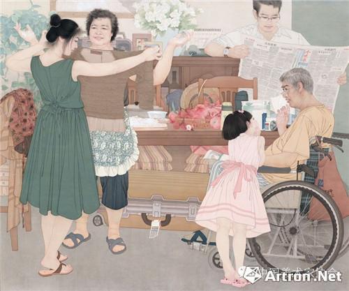 陳治:其實就是畫了一個家庭題材的場景,想把這樣一個場合的組合表現(xiàn)出一種溫情來,實際上這其中有很多故事,就像畫面中所表現(xiàn)的兒女出門在外的工作回來探望,孫女跟坐在輪椅上的爺爺聊天,母親會在第一時間按照傳統(tǒng)的習(xí)俗“長接短送”,在搟面條,在忙活,畫面中母親揚起了還沾著面的雙手,說明的是兒媳婦盡孝的心情,所以母親一邊干活一邊試衣服。