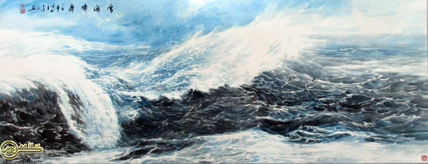 繼良先生是傳統中國畫的集大成者,他對山水、花鳥、人物無所不精,無所不能,早在青少年時代他就拜師于溥松窗、周懷民名下,他除了對老師的作品心追手摹外還以最大的力度打進傳統,把繪畫的觸角伸向晉唐宋元,沉潛在各家各派的繪畫樣式中吸收著藝術的維他命,尤其是對何海霞大師教導要向生活討靈感更是體會有加,他一面外師造化中得心源,一面注重讀萬卷書,行萬里路,搜盡奇峰打草稿,并努力在傳統和現代,東方和西方,潑和寫,象和意的對立統一中做到了出和入的辯證超越。這種量的累積最終象涓涓細流經年累月奔流不息匯合而成大江大海,并最終把藝術追求定位在大海的描繪上,他也同時把所有的激情都傾注在對大海的觀察、體會、感受、耕耘,研究上,兼容并蓄,大膽創新,用筆簡明流暢、章法考究規范、刻畫細致真切意蘊深遠。無論是謀篇造勢還是筆墨渲染都顯示出其嫻熟的藝術功力。