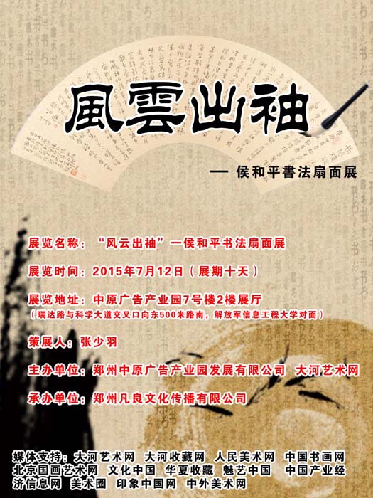 2015年7月12日,由鄭州中原廣告產業園發展有限公司、大河藝術網主辦,鄭州凡良文化傳播有限公司承辦的“風云出袖”——侯和平書法扇面展將在鄭州中原國家產業園拉開帷幕。