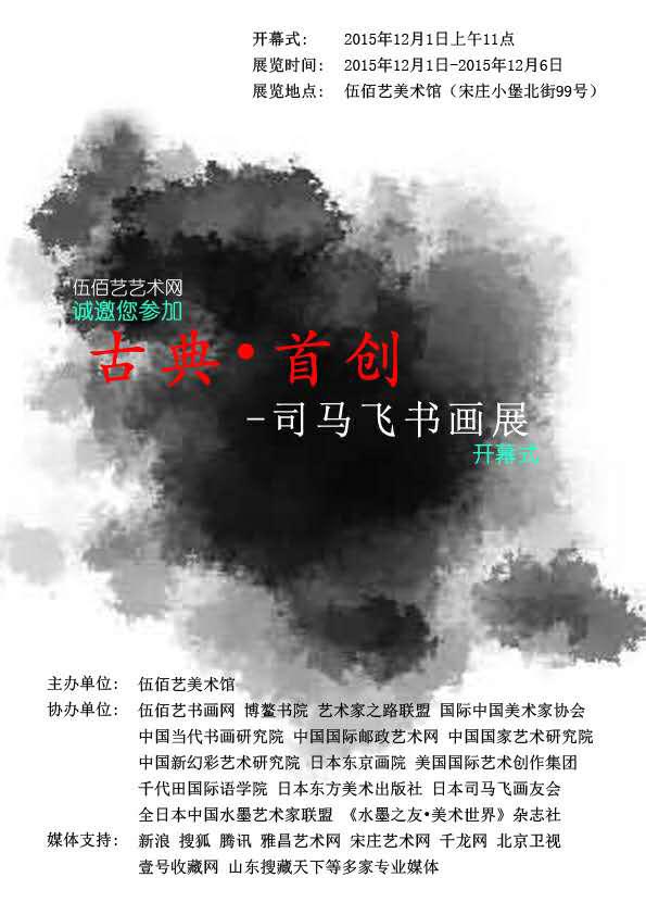 展訊:由伍佰藝美術館主辦的“古典·首創—司馬飛書畫展”將于2015年12月1日上午11點在北京市通州區宋莊伍佰藝美術館開幕。據悉,伍佰藝藝術網、博鰲書院、藝術家之路聯盟、國際中國美術家協會、中國當代書畫研究院、中國國際郵政藝術網、中國國家藝術研究院、中國新幻彩藝術研究院、《水墨之友·美術世界》雜志社、日本東京畫院、美國國際藝術創作集團、日本東方美術出版社、千代田國際語學院、全日本中國水墨藝術家聯盟、日本司馬飛畫友會、, 山東大學金諦國際交流中心、鄭州大學中國畫研究院等機構對此次展覽給予了大力的支持。