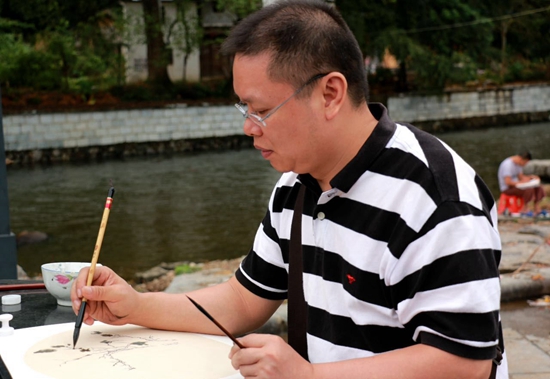 “意象瀟賀”活動第一站第一回:黃姚古鎮——且坐喫茶,第二站第二回:秀水福溪——福溪·福兮,第三站第三回:賀街古城——中流砥柱,第四站第四回:桂嶺老街——一嶺三省,第五站第五回:賀州市區——愛蓮·說,等等。第一回的成員有黃遠回、王祥清、尹天石、孟遠烘、鐘前、陳木榮6位藝術家,第二回增加了李鴻光、何明、毛廷勇3位藝術家。畫家們一起去秀水、福溪寫生,有時還與外地畫家一起去那里寫生。寫生的時候有辛苦,但更多的是快樂,享受休閑時光的快樂,與朋友相聚的快樂,以及徜徉在藝術的精神世界里的快樂。與第一回相比,大家的作品又上了一個層次,這是進步的快樂。