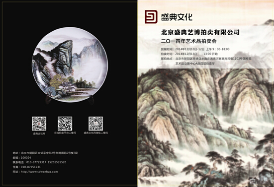 北京盛典藝博拍賣有限公司2014年藝術品拍賣會將于2014年12月13日周六在北京國粹苑藝術品交易中心A座四層拍賣廳舉行。本次拍賣會共征集拍品298件, 大部分拍品無保留價,無底價起拍,共設融怡冰雪——當代蘇工玉雕專場、晴窗漫思——當代名家紫砂專場、詩書傳家——蒙高生書法專場、澄懷——古吳藝廊珍藏名家手稿專場、小時代——當代青年學院派油畫專場、國韻——盛典易寶城陶瓷大師作品專場、大家淘——盛典古玩網會員專場等。同時本次拍賣會也將聯手盛典古玩網在線拍賣平臺同步進行預展,買家也可以通過注冊古玩網會員實現線上競價。